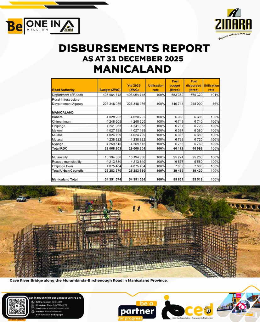 By Shingirai Vambe The Zimbabwe National Roads Administration (ZINARA) has released its disbursement report as at 31 December 2025, showing...